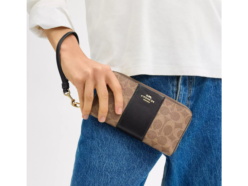 Portofel lung cu fermoar Coach din pânză Signature cu dungi, negru-maro